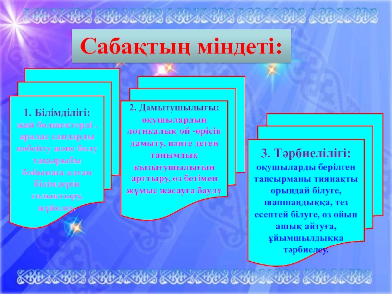 3. Тәрбиелілігі: оқушыларды берілген тапсырманы тиянақты орындай білуге, шапшаңдыққа, тез есептей білуге, өз ойын ашық айтуға, ұйымшылдыққа тәрбиелеу.