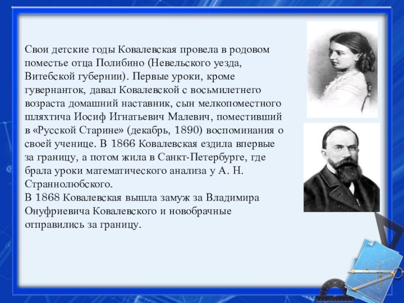 уезда, Витебской губернии). Первые уроки, кроме гувернанток, давал Ковалевской с восьмилетнего возраста домашний наставник, сын мелкопоместного шляхтича Иосиф Игнатьевич Малевич, поместивший в «Русской Старине» (декабрь, 1890) воспоминания о своей ученице. В 1866 Ковалевская ездила впервые за границу, а потом жила в Санкт-Петербурге, где брала уроки математического анализа у А. Н. Страннолюбского.