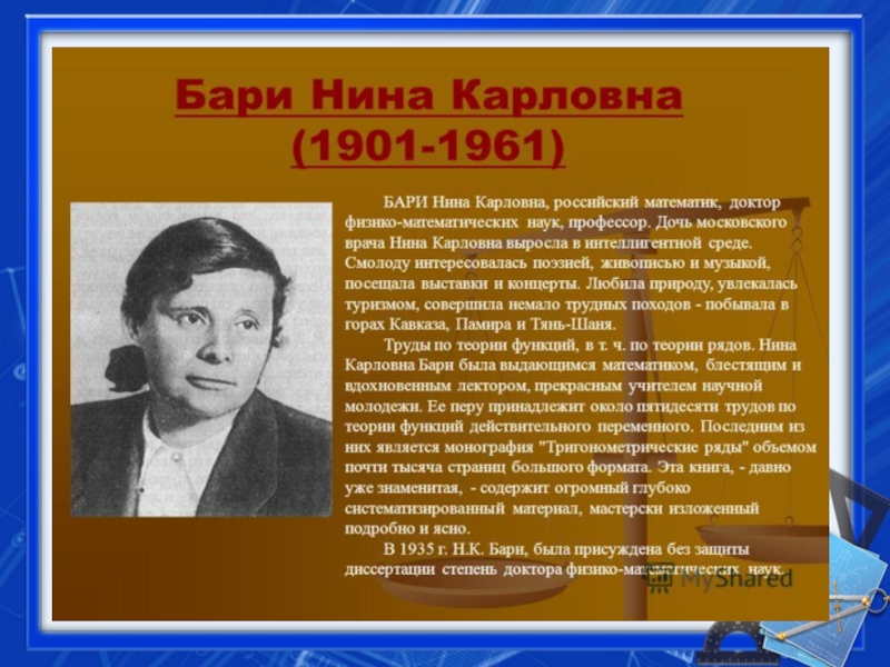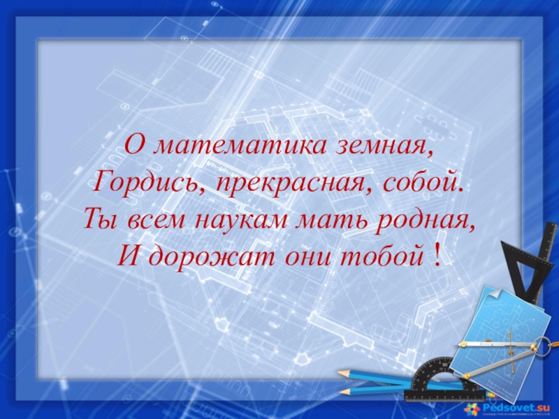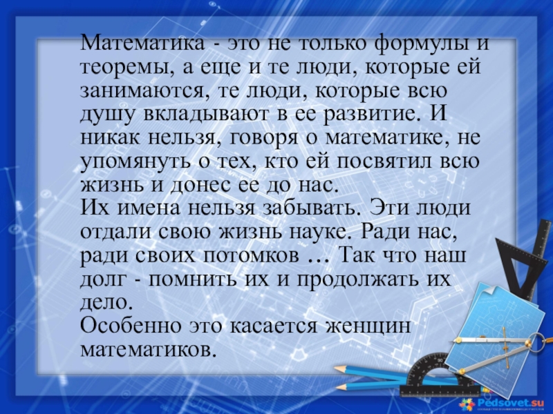 те люди, которые ей занимаются, те люди, которые всю душу вкладывают в ее развитие. И никак нельзя, говоря о математике, не упомянуть о тех, кто ей посвятил всю жизнь и донес ее до нас.