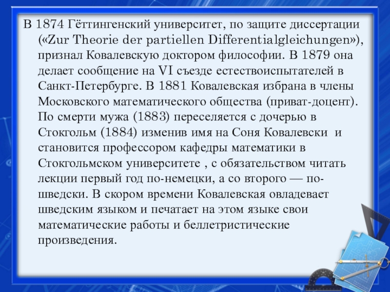 Differentialgleichungen»), признал Ковалевскую доктором философии. В 1879 она делает сообщение на VI съезде естествоиспытателей в Санкт-Петербурге. В 1881 Ковалевская избрана в члены Московского математического общества (приват-доцент). По смерти мужа (1883) переселяется с дочерью в Стокгольм (1884) изменив имя на Соня Ковалевски и становится профессором кафедры математики в Стокгольмском университете , с обязательством читать лекции первый год по-немецки, а со второго — по-шведски. В скором времени Ковалевская овладевает шведским языком и печатает на этом языке свои математические работы и беллетристические произведения.