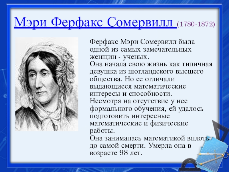 Она начала свою жизнь как типичная девушка из шотландского высшего общества. Но ее отличали выдающиеся математические интересы и способности.