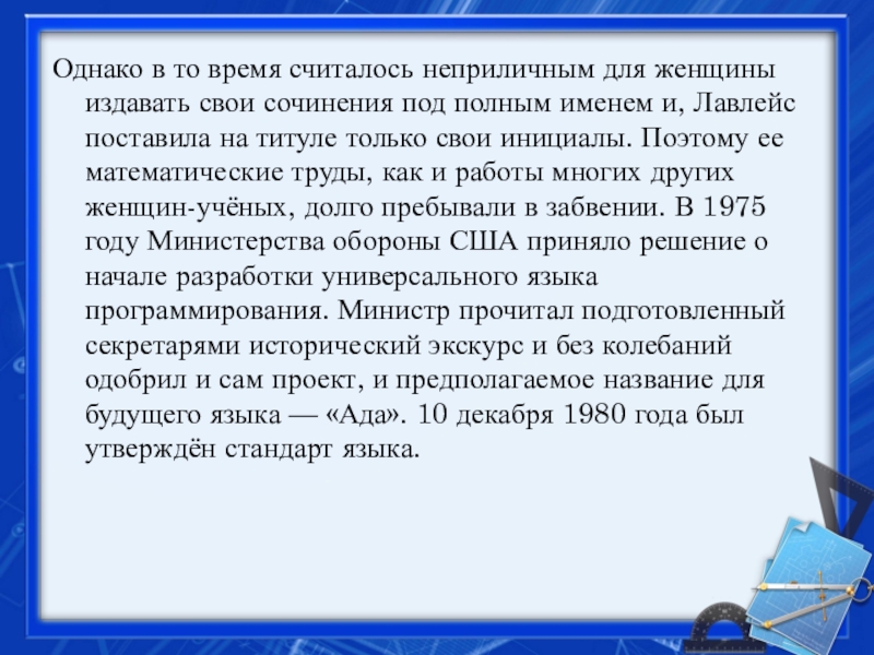 под полным именем и, Лавлейс поставила на титуле только свои инициалы. Поэтому ее математические труды, как и работы многих других женщин-учёных, долго пребывали в забвении. В 1975 году Министерства обороны США приняло решение о начале разработки универсального языка программирования. Министр прочитал подготовленный секретарями исторический экскурс и без колебаний одобрил и сам проект, и предполагаемое название для будущего языка — «Ада». 10 декабря 1980 года был утверждён стандарт языка.