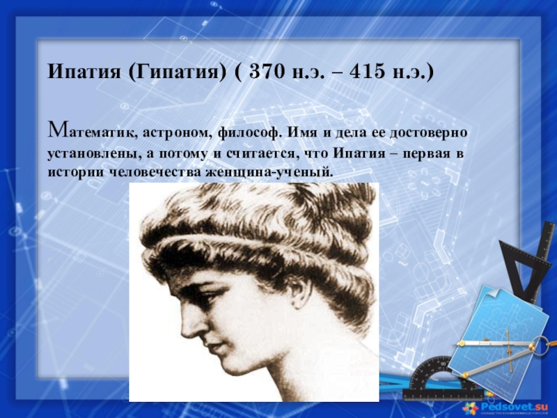 Имя и дела ее достоверно установлены, а потому и считается, что Ипатия – первая в истории человечества женщина-ученый.