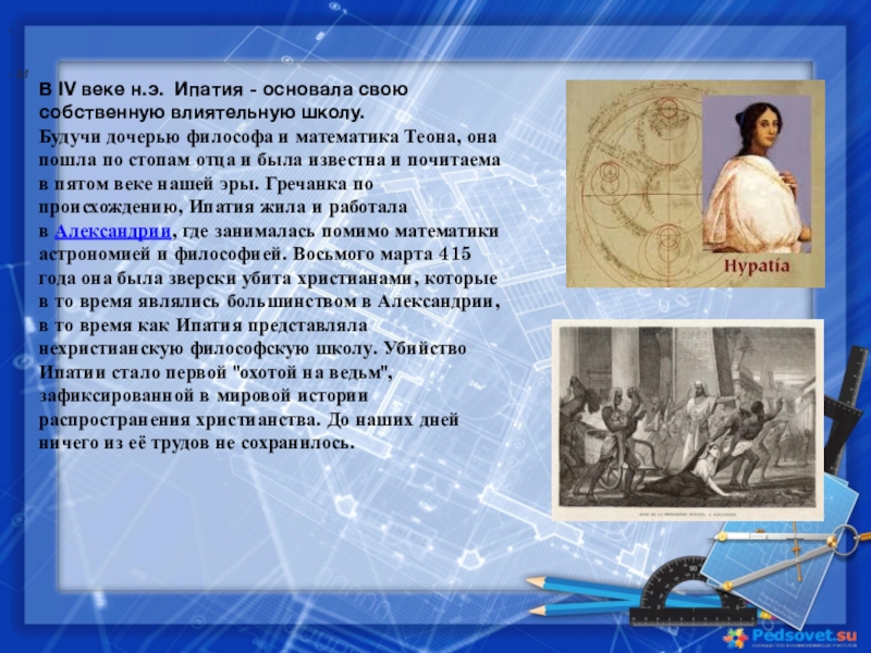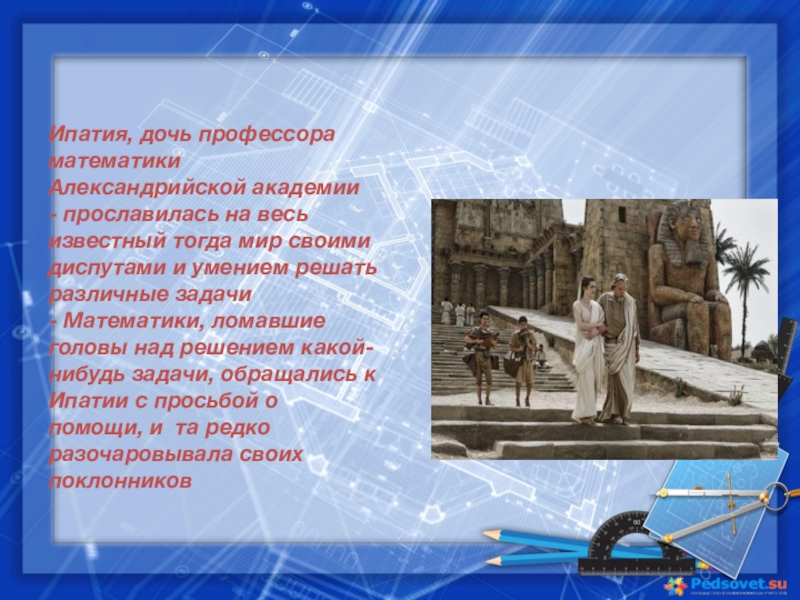 - Математики, ломавшие головы над решением какой-нибудь задачи, обращались к Ипатии с просьбой о помощи, и та редко разочаровывала своих поклонников