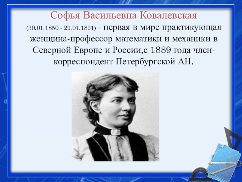(30.01.1850 - 29.01.1891) - первая в мире практикующая женщина-профессор математики и механики в Северной Европе и России,с 1889 года член-корреспондент Петербургской АН.