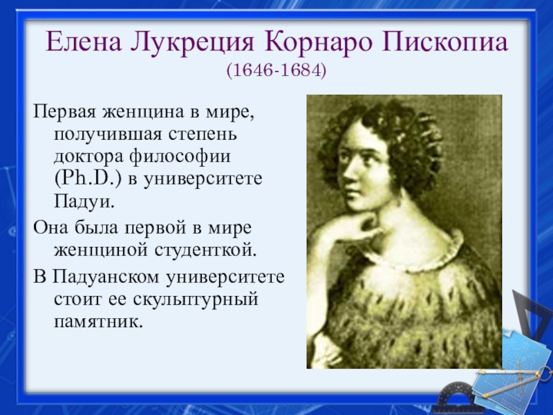 Слайд 10Елена Лукреция Корнаро Пископиа (1646-1684)