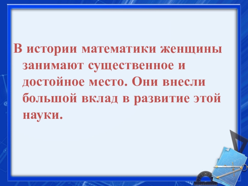 Слайд 33В истории математики женщины занимают существенное и достойное место. Они внесли