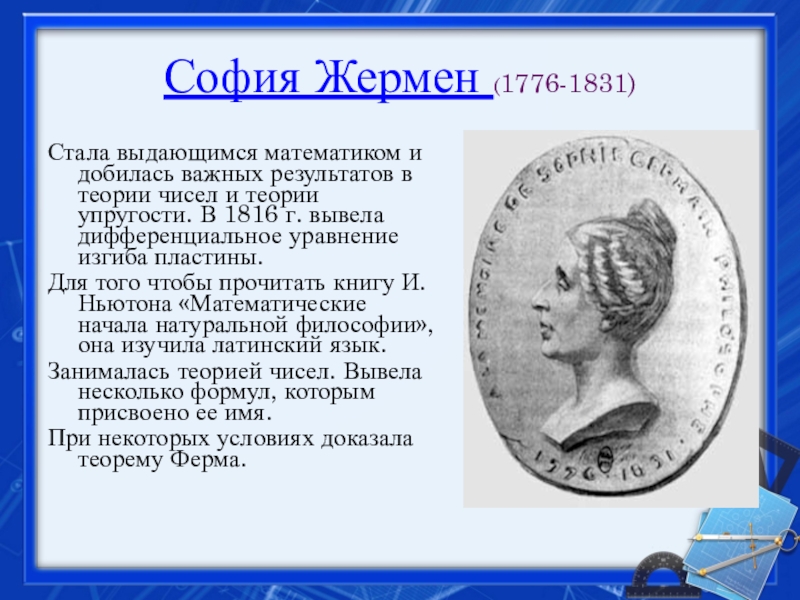 теории чисел и теории упругости. В 1816 г. вывела дифференциальное уравнение изгиба пластины.