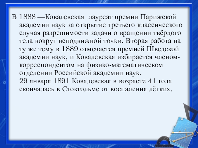 Слайд 31В 1888 —Ковалевская лауреат премии Парижской академии наук за открытие третьего