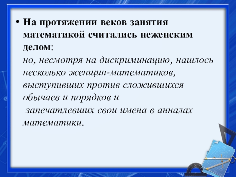 Слайд 4На протяжении веков занятия математикой считались неженским делом: