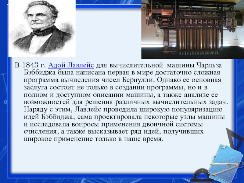 в мире достаточно сложная программа вычисления чисел Бернулли. Однако ее основная заслуга состоит не только в создании программы, но и в полном и доступном описании машины, а также анализе ее возможностей для решения различных вычислительных задач. Наряду с этим, Лавлейс проводила широкую популяризацию идей Бэббиджа, сама проектировала некоторые узлы машины и исследовала вопросы применения двоичной системы счисления, а также высказывает ряд идей, получивших широкое применение только в наше время.