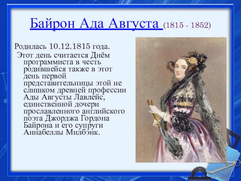 Слайд 15Байрон Ада Августа (1815 - 1852)