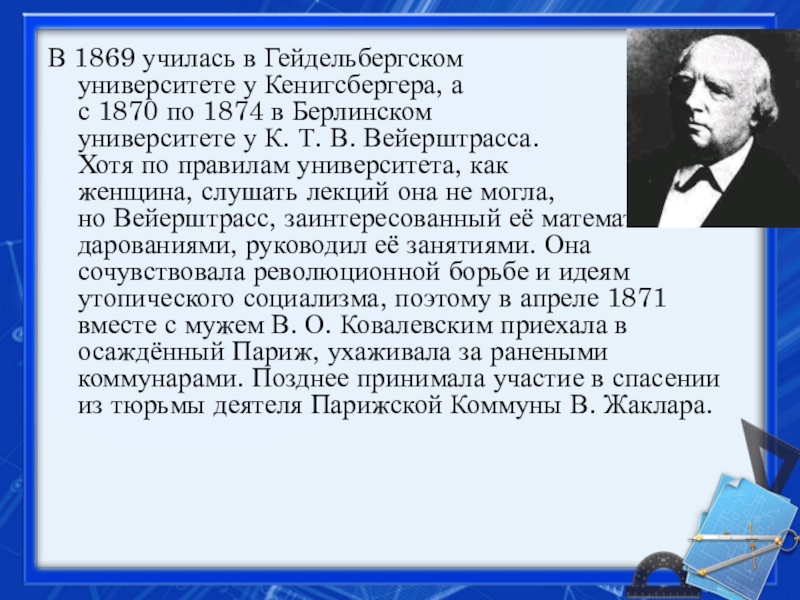 университете у Кенигсбергера, а с 1870 по 1874 в Берлинском университете у К. Т. В. Вейерштрасса. Хотя по правилам университета, как женщина, слушать лекций она не могла, но Вейерштрасс, заинтересованный её математическими дарованиями, руководил её занятиями. Она сочувствовала революционной борьбе и идеям утопического социализма, поэтому в апреле 1871 вместе с мужем В. О. Ковалевским приехала в осаждённый Париж, ухаживала за ранеными коммунарами. Позднее принимала участие в спасении из тюрьмы деятеля Парижской Коммуны В. Жаклара.