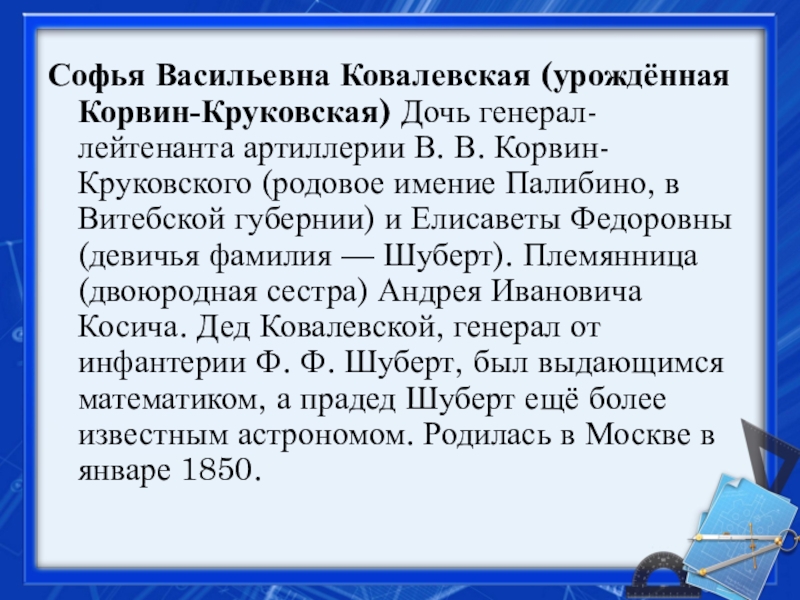 Слайд 27Софья Васильевна Ковалевская (урождённая Корвин-Круковская) Дочь генерал-лейтенанта артиллерии В. В. Корвин-Круковского