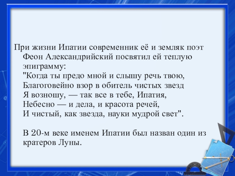 Слайд 9При жизни Ипатии современник её и земляк поэт Феон Александрийский посвятил