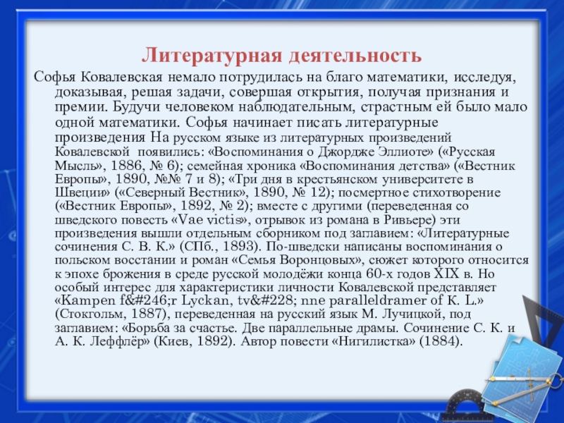 задачи, совершая открытия, получая признания и премии. Будучи человеком наблюдательным, страстным ей было мало одной математики. Софья начинает писать литературные произведения На русском языке из литературных произведений Ковалевской появились: «Воспоминания о Джордже Эллиоте» («Русская Мысль», 1886, № 6); семейная хроника «Воспоминания детства» («Вестник Европы», 1890, №№ 7 и 8); «Три дня в крестьянском университете в Швеции» («Северный Вестник», 1890, № 12); посмертное стихотворение («Вестник Европы», 1892, № 2); вместе с другими (переведенная со шведского повесть «Vae victis», отрывок из романа в Ривьере) эти произведения вышли отдельным сборником под заглавием: «Литературные сочинения С. В. К.» (СПб., 1893). По-шведски написаны воспоминания о польском восстании и роман «Семья Воронцовых», сюжет которого относится к эпохе брожения в среде русской молодёжи конца 60-х годов XIX в. Но особый интерес для характеристики личности Ковалевской представляет «Kampen för Lyckan, tvä nne paralleldramer of К. L.» (Стокгольм, 1887), переведенная на русский язык М. Лучицкой, под заглавием: «Борьба за счастье. Две параллельные драмы. Сочинение С. К. и А. К. Леффлёр» (Киев, 1892). Автор повести «Нигилистка» (1884).