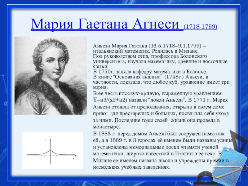В ее честь плоскую кривую, выраженную уравнением Y=a3/(x2+a2) назвали “локон Аньези”. В 1771 г. Мария Аньези отошла от преподавания, открыла в своем доме приют для престарелых и больных, посвятила себя уходу за ними. Последние годы своей жизни она провела в монастыре.
