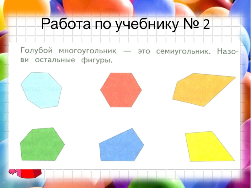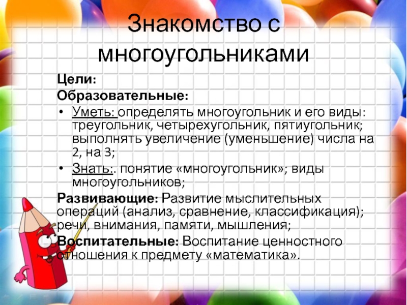 Знакомство с многоугольникамиЦели:Образовательные:Уметь: определять многоугольник и его виды: треугольник, четырехугольник, пятиугольник; выполнять увеличение (уменьшение) числа на 2,