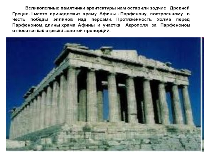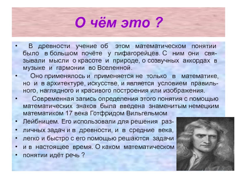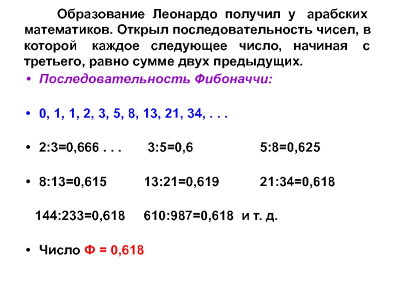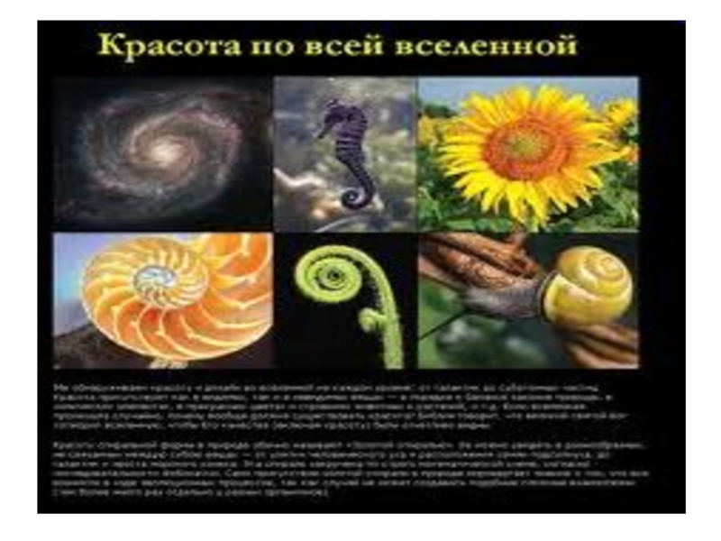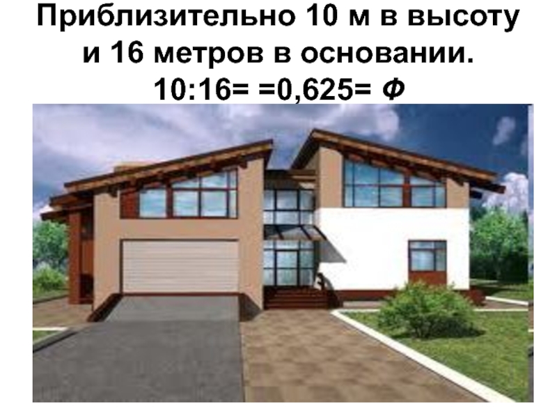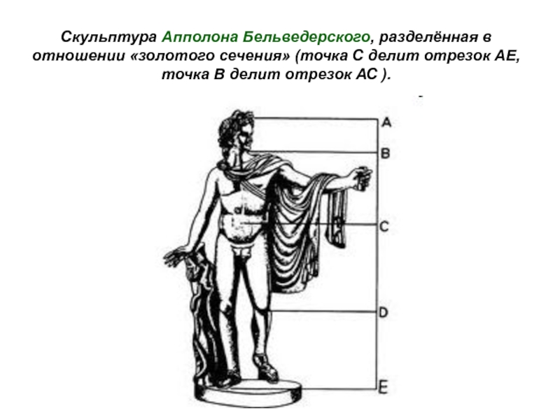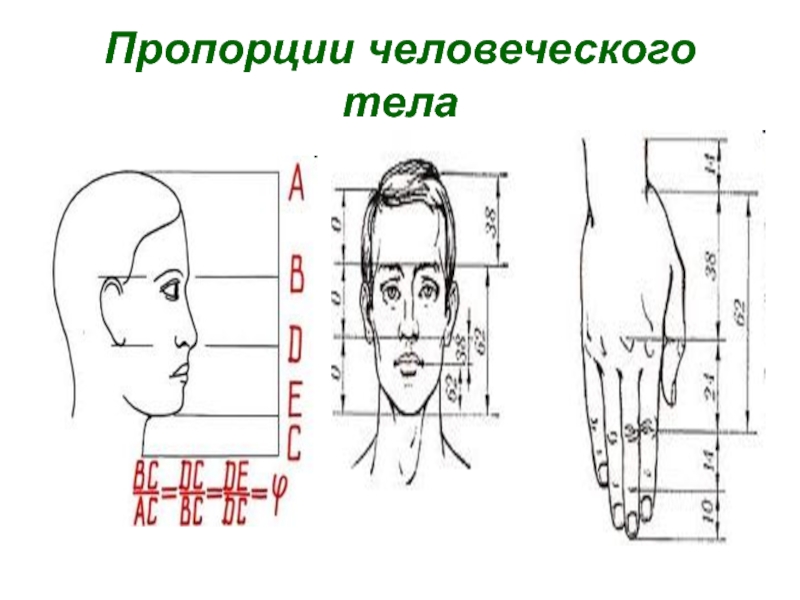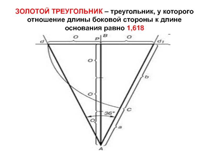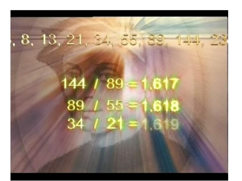 Золотым сечением и даже «божественной пропорцией» называли математики древности и средневековья деление отрезка, при котором длина всего отрезка так относится к длине его большей части, как длина большей части к мень-шей. На рисунке точка D делит отрезок АВ в отношении золото-го сечения. Это отношение приближённо равно 1,625 = 13 : 8 .