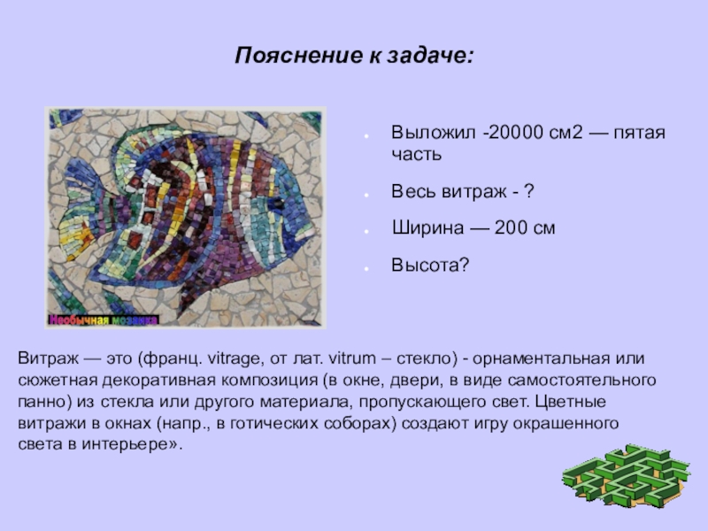 Витраж — это (франц. vitrage, от лат. vitrum – стекло) - орнаментальная или сюжетная декоративная композиция (в окне, двери, в виде самостоятельного панно) из стекла или другого материала, пропускающего свет. Цветные витражи в окнах (напр., в готических соборах) создают игру окрашенного света в интерьере».
