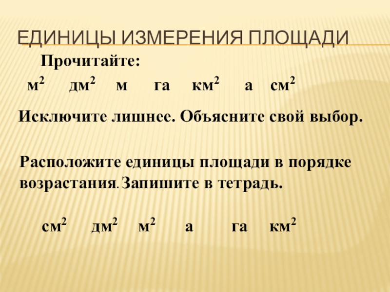 Расположите единицы площади в порядке возрастания. Запишите в тетрадь.