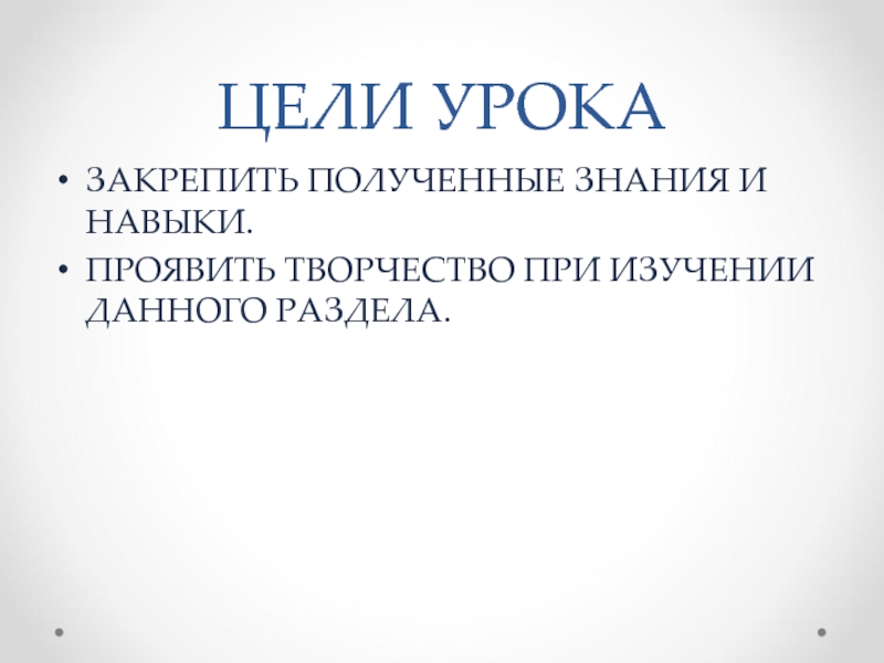 ЦЕЛИ УРОКАЗАКРЕПИТЬ ПОЛУЧЕННЫЕ ЗНАНИЯ И НАВЫКИ.ПРОЯВИТЬ ТВОРЧЕСТВО ПРИ ИЗУЧЕНИИ ДАННОГО РАЗДЕЛА.