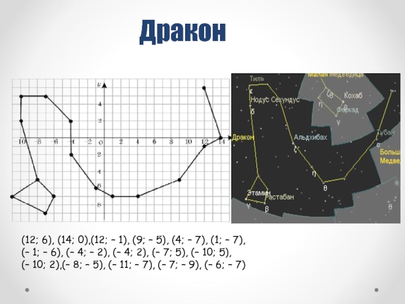 Дракон(12; 6), (14; 0),(12; – 1), (9; – 5), (4; – 7), (1; – 7),(– 1; – 6), (– 4; – 2), (– 4; 2),