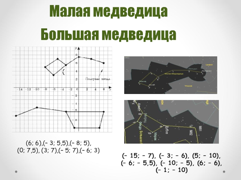 Малая медведица Большая медведица((6; 6),(– 3; 5,5),(– 8; 5),(0; 7,5), (3; 7),(– 5; 7),(– 6; 3)(– 15; – 7), (– 3; – 6), (5; – 10),