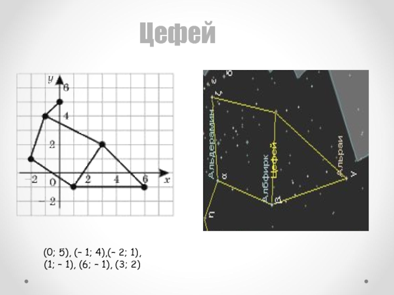 Цефей(0; 5), (– 1; 4),(– 2; 1),(1; – 1), (6; – 1), (3; 2)