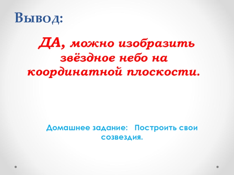 Вывод:Домашнее задание:  Построить свои созвездия. ДА, можно изобразить звёздное небо на координатной плоскости.