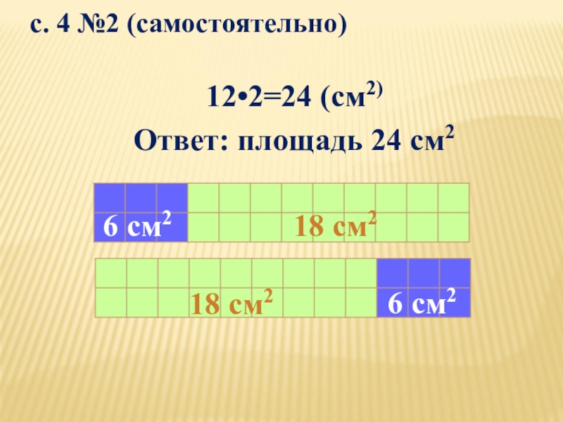 с. 4 №2 (самостоятельно)12•2=24 (см2)Ответ: площадь 24 см26 см26 см218 см218 см2