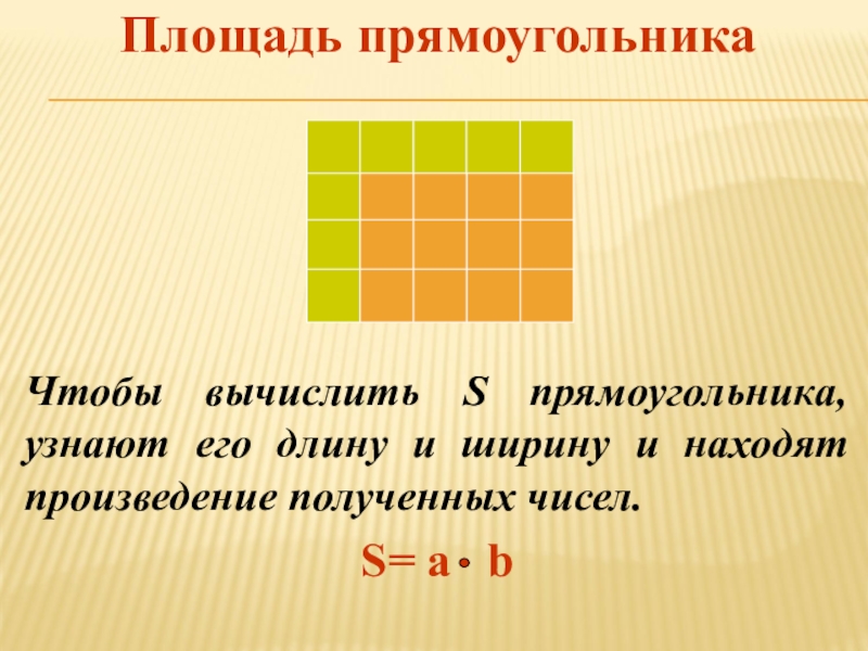 Площадь прямоугольникаЧтобы вычислить S прямоугольника, узнают его длину и ширину и находят произведение полученных чисел.S= a