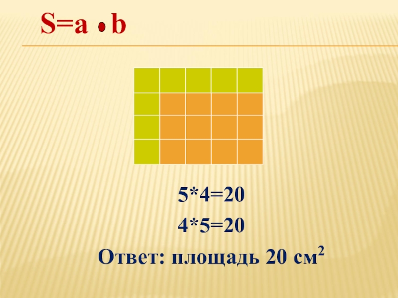 S=a  b5*4=204*5=20Ответ: площадь 20 см2