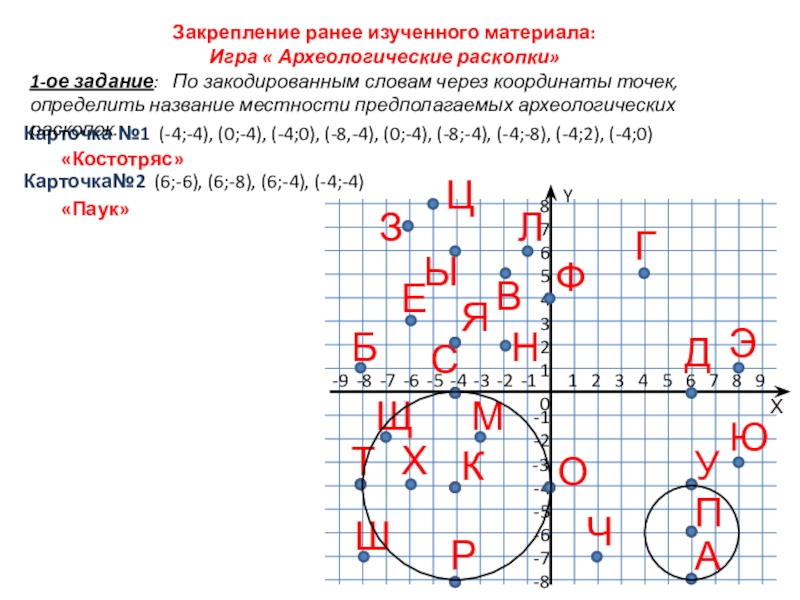 1-ое задание: По закодированным словам через координаты точек, определить название местности предполагаемых археологических раскопок.