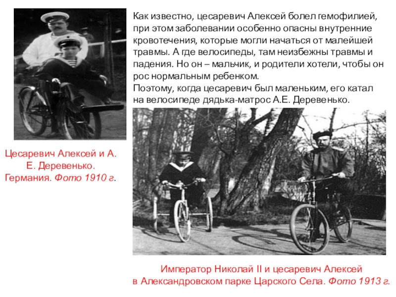 Поэтому, когда цесаревич был маленьким, его катал на велосипеде дядька-матрос А.Е. Деревенько.
