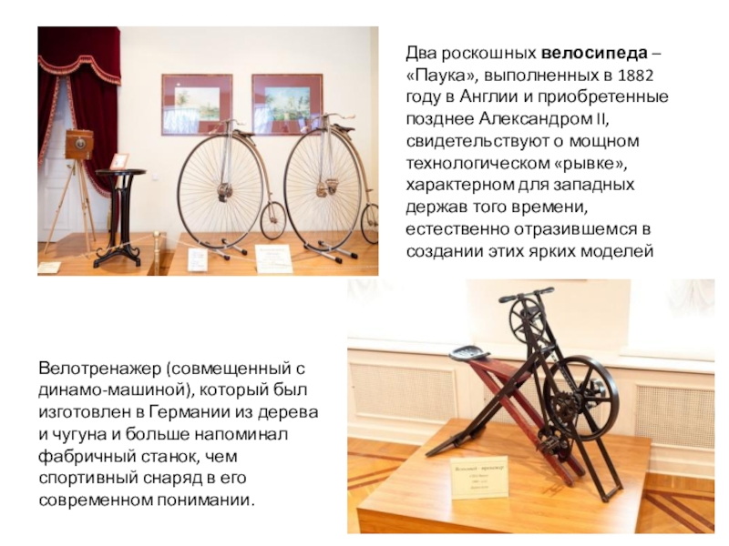 Велотренажер (совмещенный с динамо-машиной), который был изготовлен в Германии из дерева и чугуна и больше напоминал фабричный станок, чем спортивный снаряд в его современном понимании.