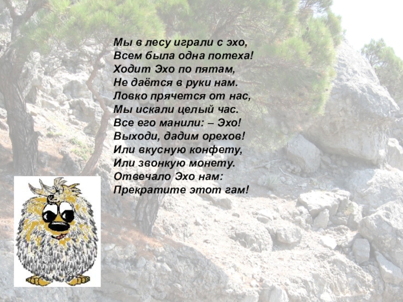 Всем была одна потеха! Ходит Эхо по пятам, Не даётся в руки нам. Ловко прячется от нас, Мы искали целый час. Все его манили: – Эхо! Выходи, дадим орехов! Или вкусную конфету, Или звонкую монету. Отвечало Эхо нам: Прекратите этот гам!