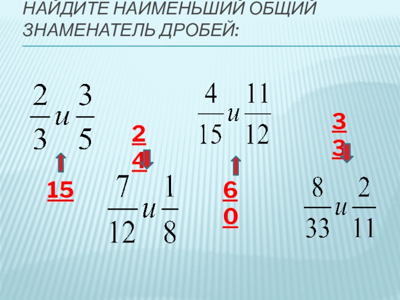 Слайд 5Найдите наименьший общий знаменатель дробей: