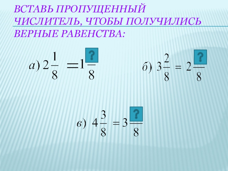 Слайд 4Вставь пропущенный числитель, чтобы получились верные равенства: