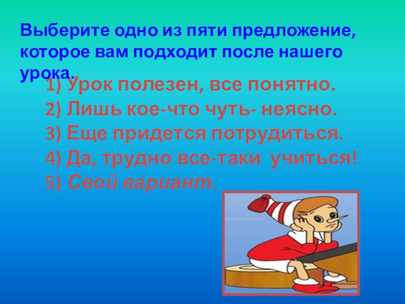 Выберите одно из пяти предложение, которое вам подходит после нашего урока.