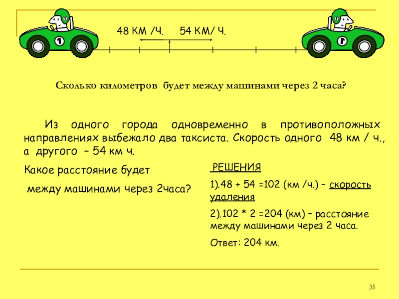 2).102 * 2 =204 (км) – расстояние между машинами через 2 часа.