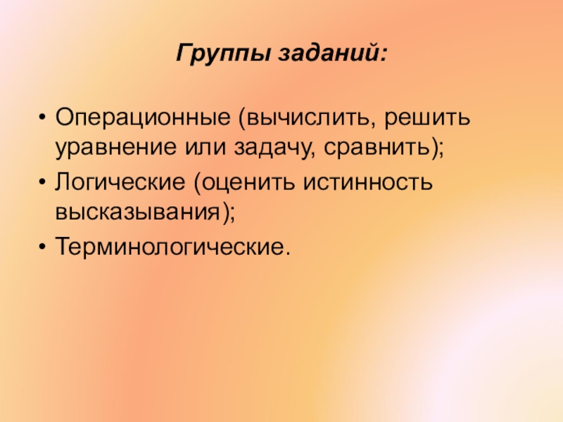 Операционные (вычислить, решить уравнение или задачу, сравнить);