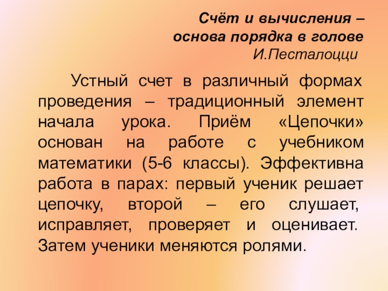 Устный счет в различный формах проведения – традиционный элемент начала урока. Приём «Цепочки» основан на работе с учебником математики (5-6 классы). Эффективна работа в парах: первый ученик решает цепочку, второй – его слушает, исправляет, проверяет и оценивает. Затем ученики меняются ролями.