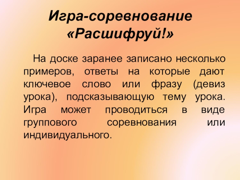 ответы на которые дают ключевое слово или фразу (девиз урока), подсказывающую тему урока. Игра может проводиться в виде группового соревнования или индивидуального.