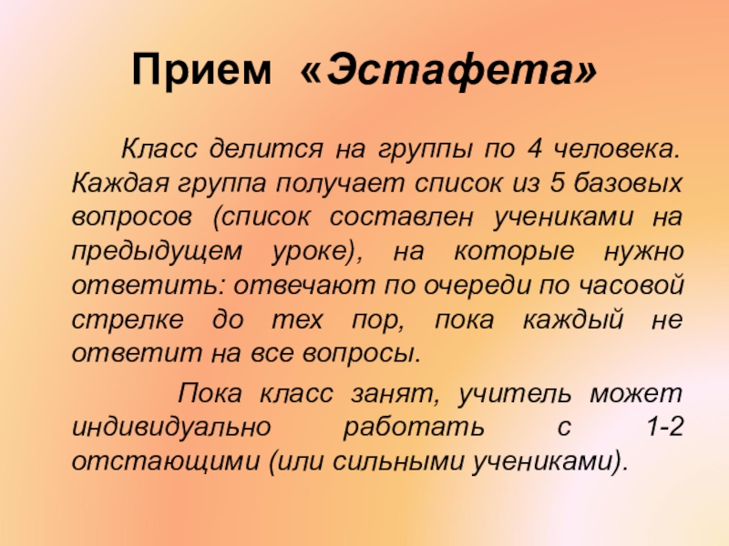 4 человека. Каждая группа получает список из 5 базовых вопросов (список составлен учениками на предыдущем уроке), на которые нужно ответить: отвечают по очереди по часовой стрелке до тех пор, пока каждый не ответит на все вопросы.