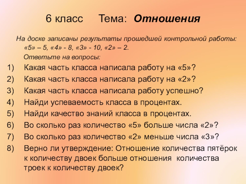 прошедшей контрольной работы: «5» – 5, «4» - 8, «3» - 10, «2» – 2.