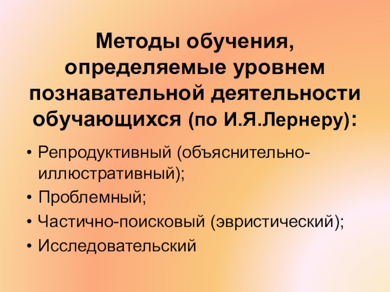 Слайд 11Методы обучения, определяемые уровнем познавательной деятельности обучающихся (по И.Я.Лернеру):