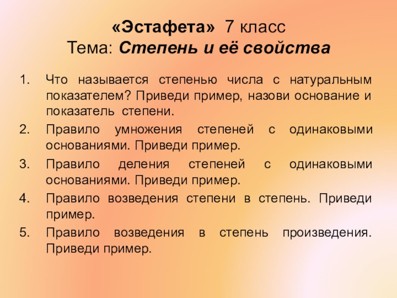 с натуральным показателем? Приведи пример, назови основание и показатель степени.