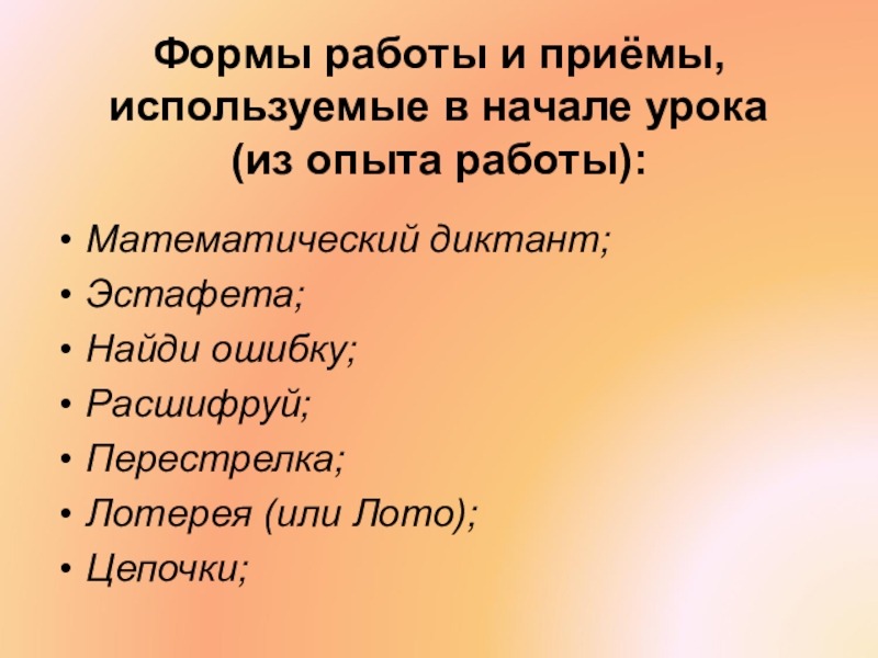 Слайд 14Формы работы и приёмы, используемые в начале урока