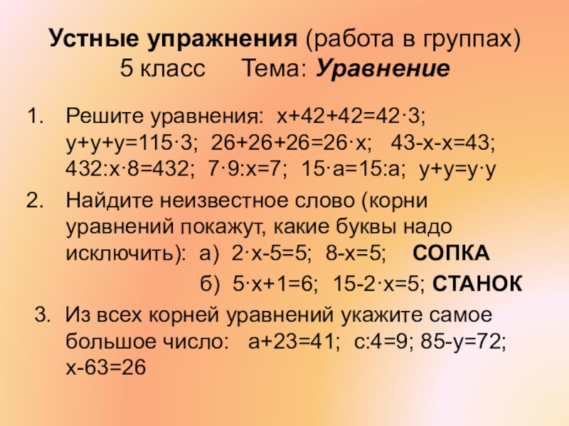 Найдите неизвестное слово (корни уравнений покажут, какие буквы надо исключить): а) 2·х-5=5; 8-х=5; СОПКА